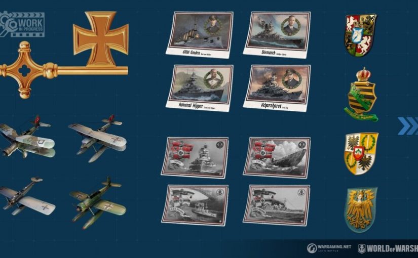 The “German Navy” collection consists of six sections, with six elements in each. Elements of the collection can be obtained from the event containers, and also daily containers if you’ve activated the subscription. The reward for completing the collection is the ability to mount two flags and alternative camouflage patterns on German ships.