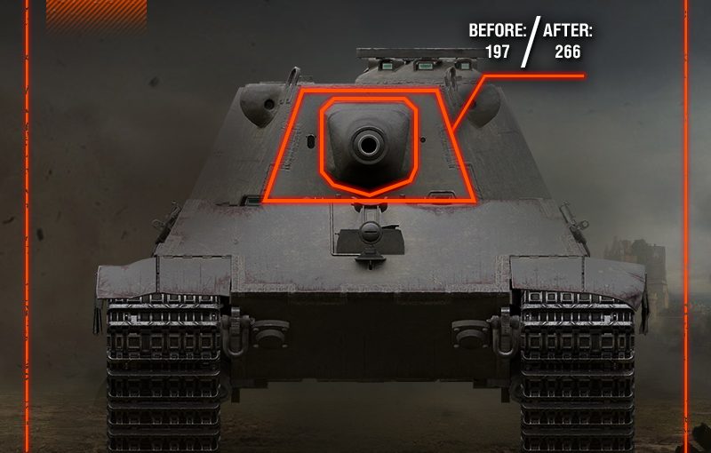 Of the two German Tier X MTs, the E-50M is the more protected and durable one. Due to its frontal armor, the vehicle is somewhat like a heavy tank. Nevertheless, the thickness of the turret’s frontal armor plate is insufficient to repel shots from high-tier opponents. We plan on improving the protection of this area by increasing the thickness of the turret’s effective armor from 197 to 266 mm.