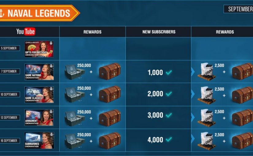 Be on the lookout for bonus codes shown in each episode of the historical marathon. As with the in-game Daily Shipments, all gifts are revealed in advance! Each bonus code will unlock a chain of combat missions. Complete them all to get four containers of the new “Five Epochs of the Navy” collection and 1,000,000 credits!